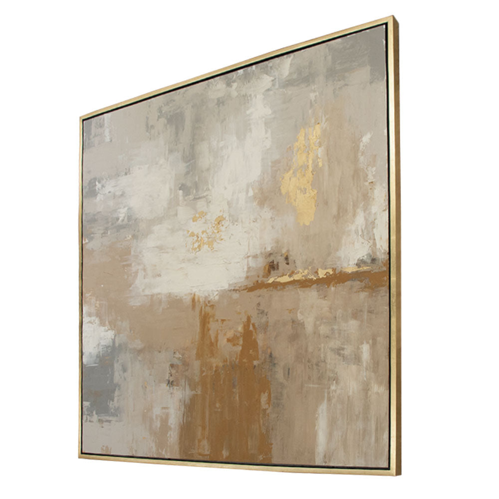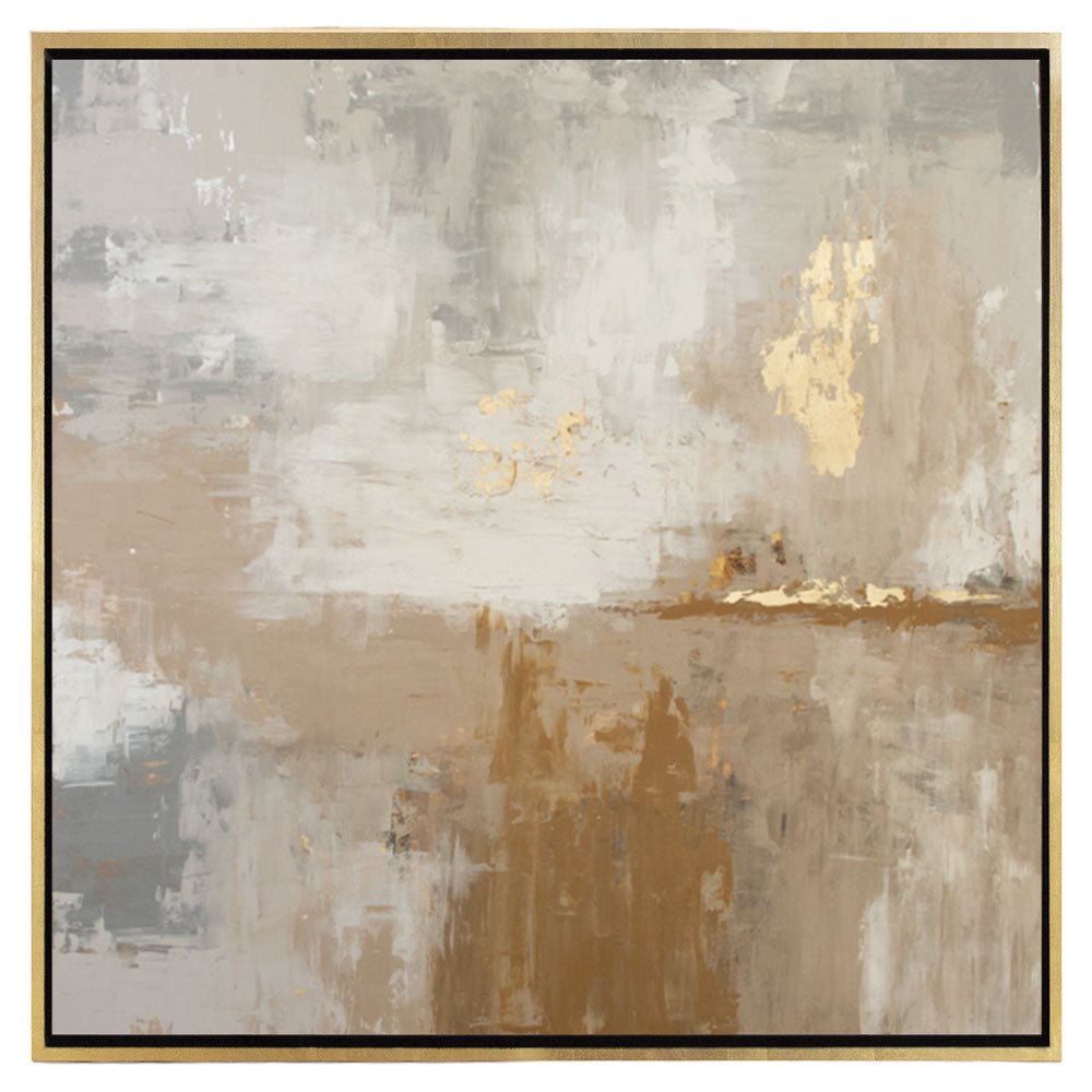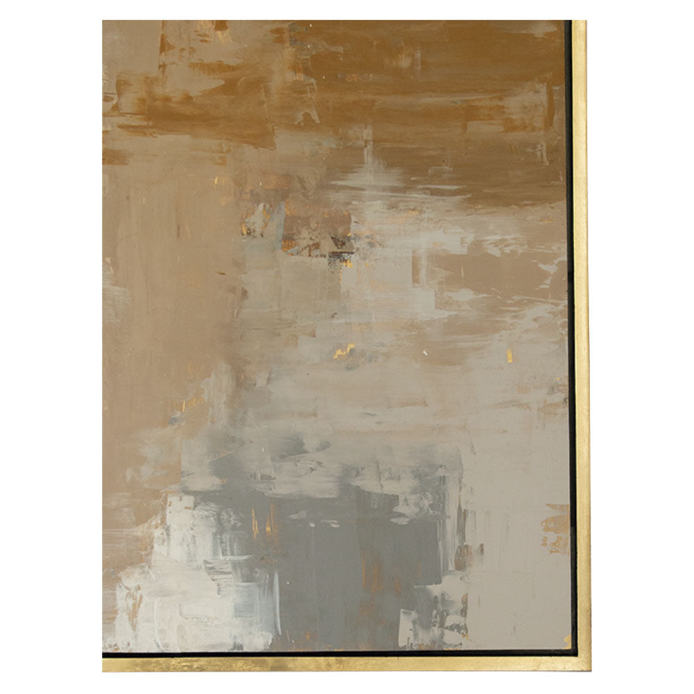 Arte abstracto realizado 100% a mano en técnica mixta de acrílicos y hoja sobre marco entrecalle oro.
