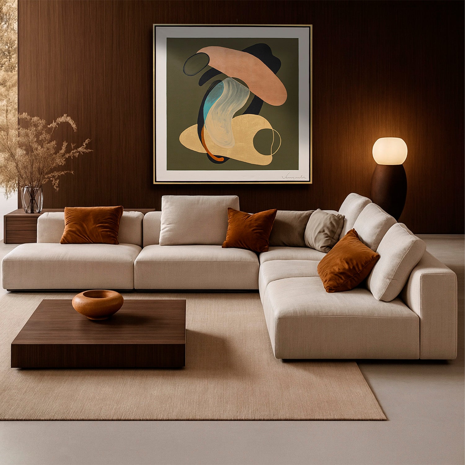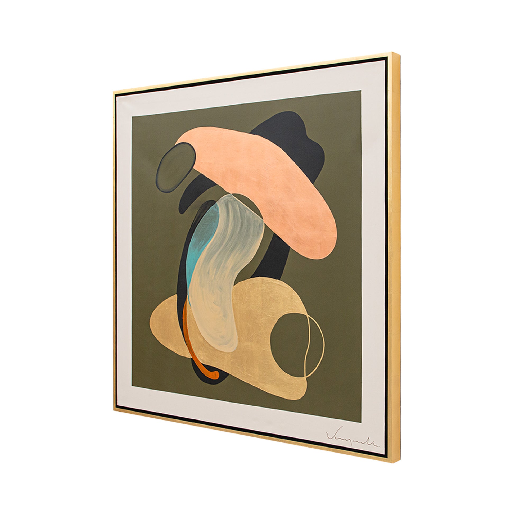 Arte abstracto pintado 100% a mano en técnica mixta montado sobre bastidor de tela con aplicación de acrílicos, hoja de oro y bronce. Marco de madera cubierto en hoja de oro.