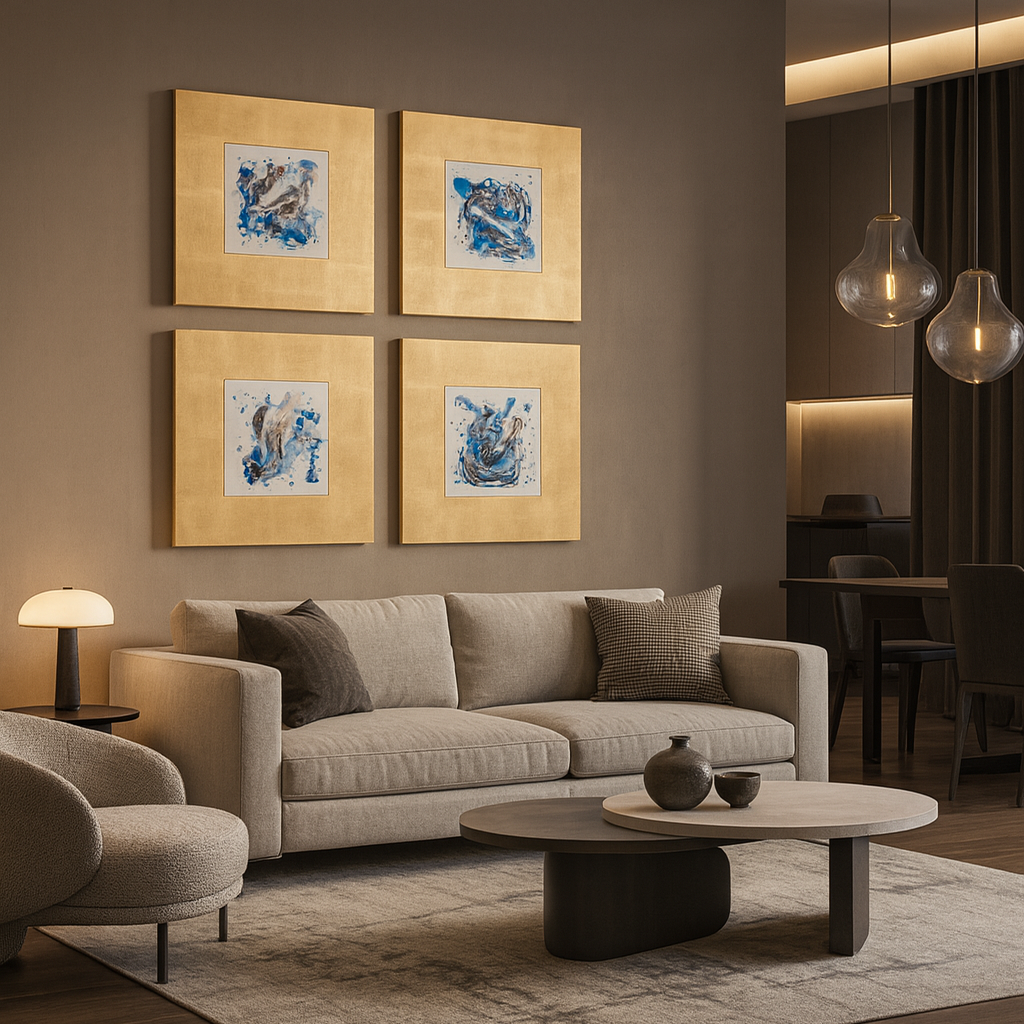 Set de 4 piezas de arte abstracto pintado 100% a mano en técnica mixta montado sobre bastidor de madera. Sin marco.