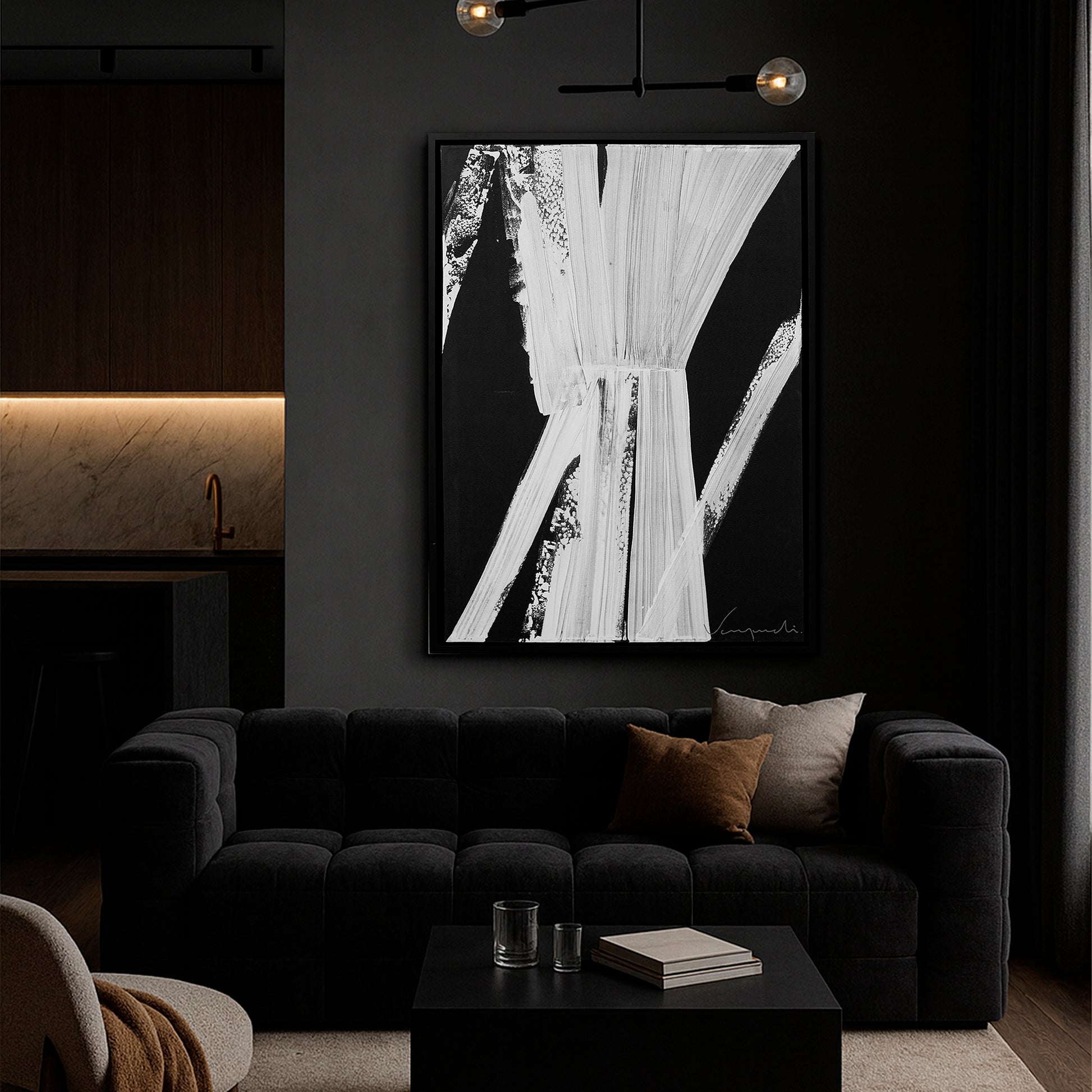 Arte abstracto pintado 100% a mano en técnica mixta montado sobre bastidor de tela con aplicación de acrílicos. Marco de madera negro.