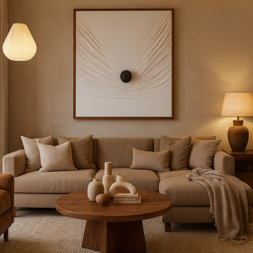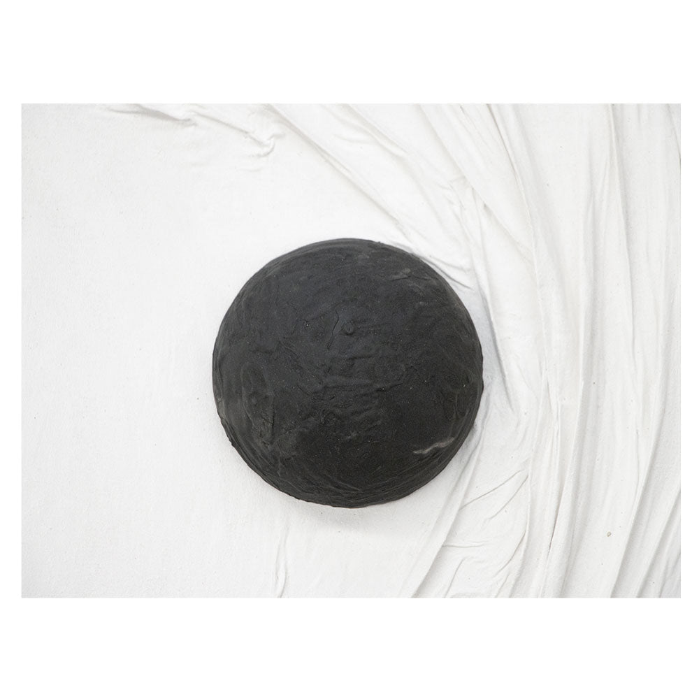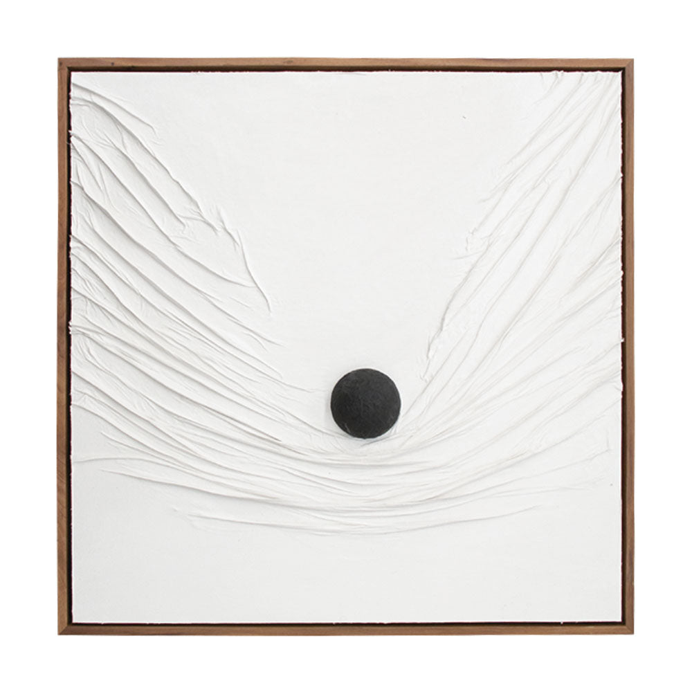 Cuadro arte abstracto en técnica mixta de tela con relieve, acrílicos y esferas en acabado negro mate montado en marco de parota sólida entrecalle.