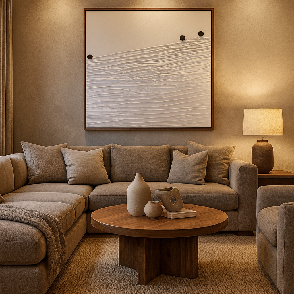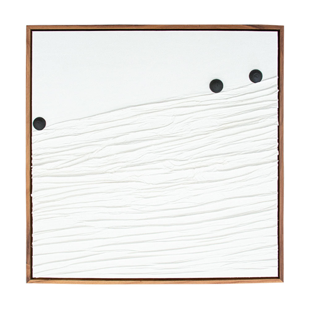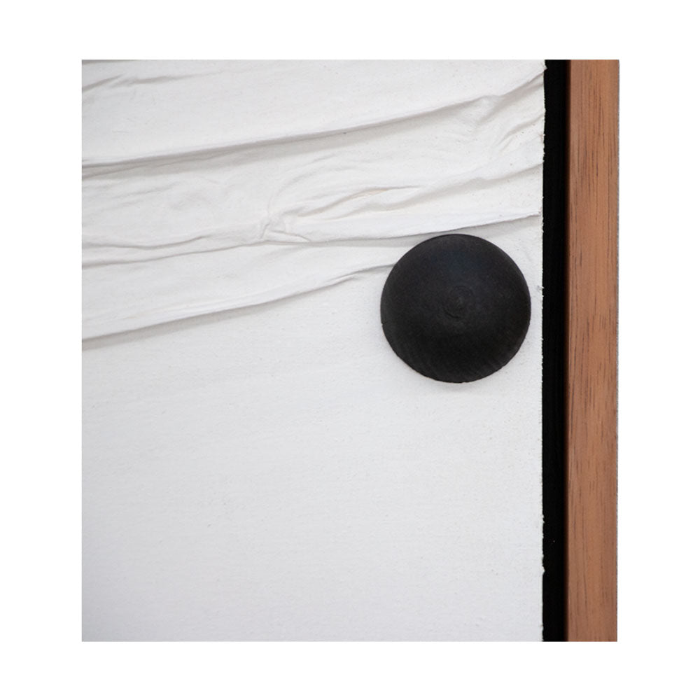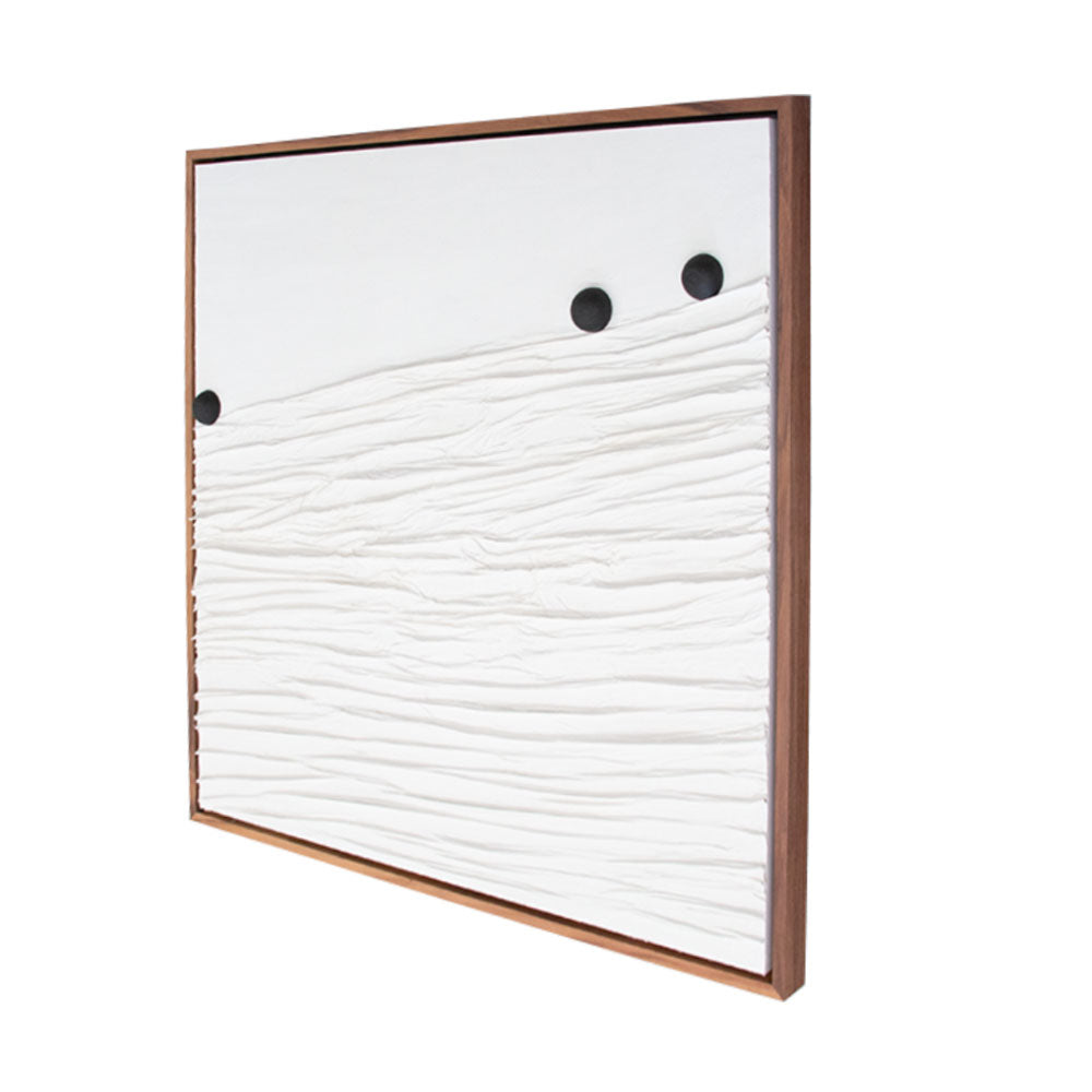 Cuadro arte abstracto en técnica mixta de tela con relieve, acrílicos y esferas en acabado negro mate montado en marco de parota sólida entrecalle.
