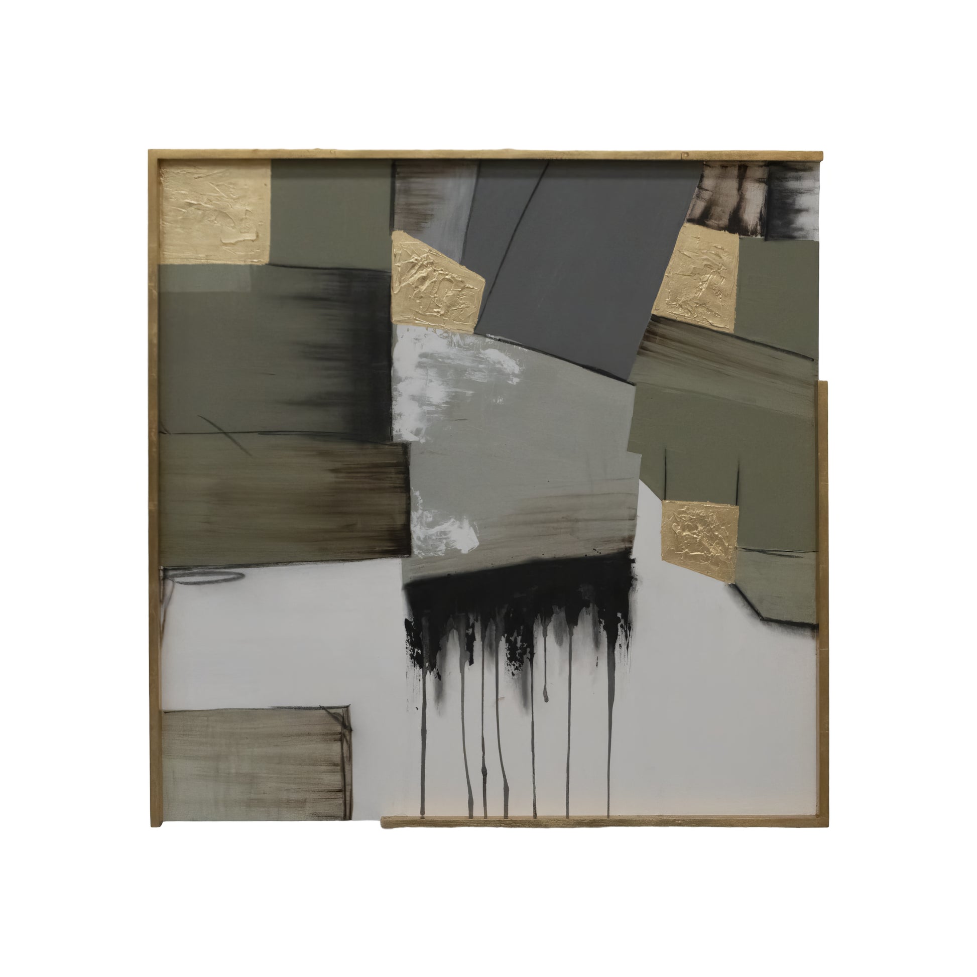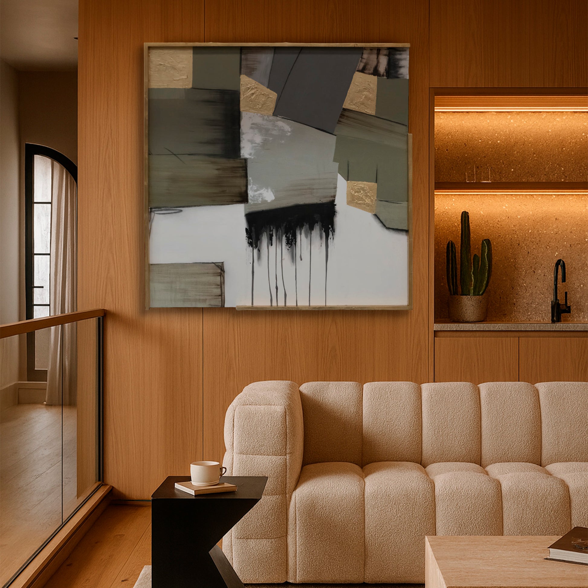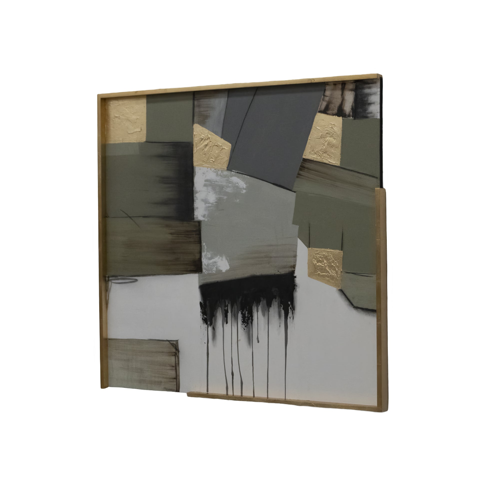 Arte abstracto pintado 100% a mano con técnica mixta montado sobre un bastidor de madera con aplicación de acrílicos, hoja de oro y betún. Marco de madera esquinado cubierto en hoja de oro.