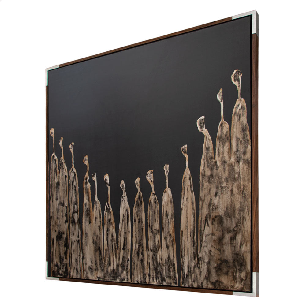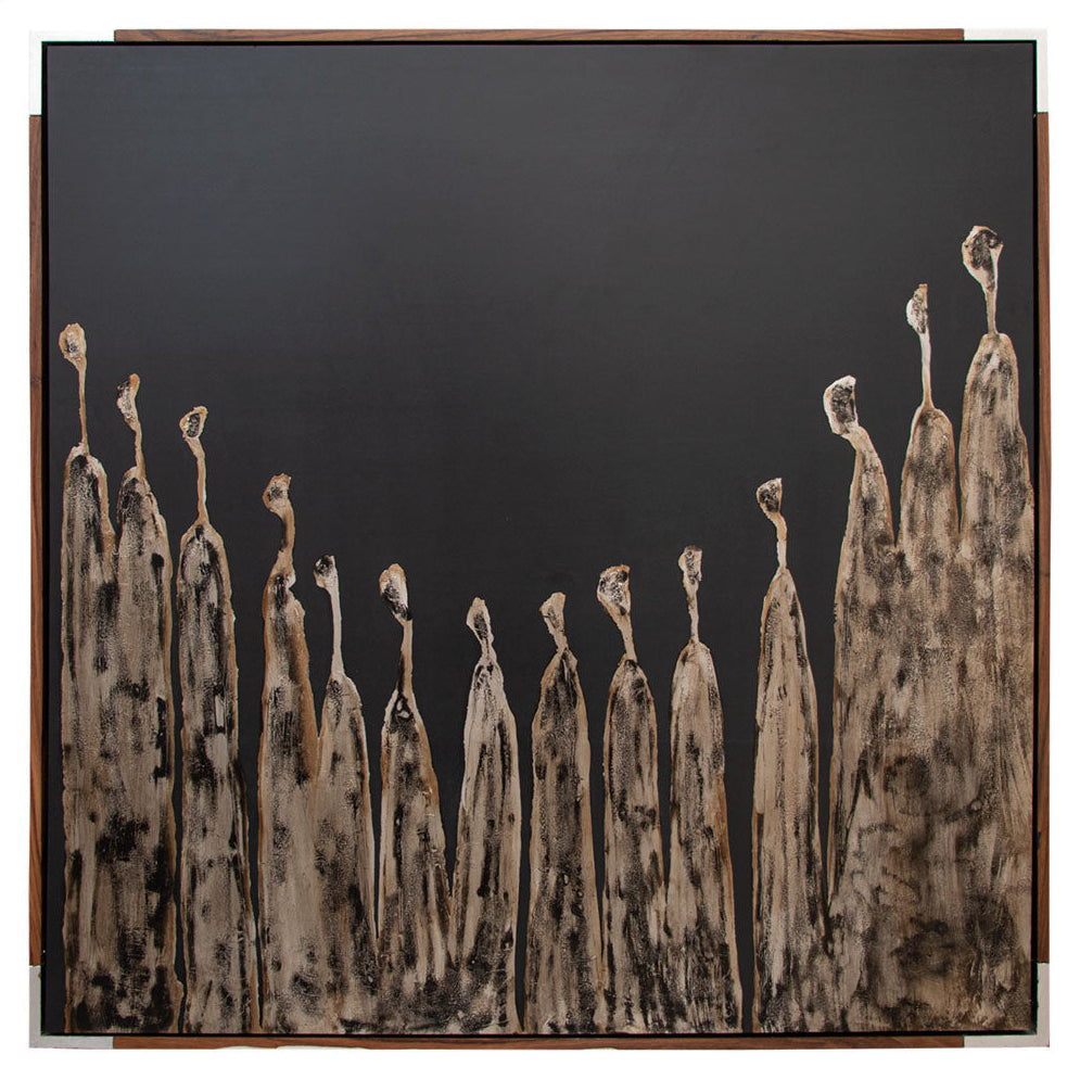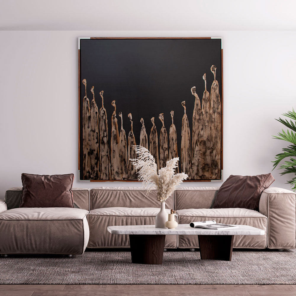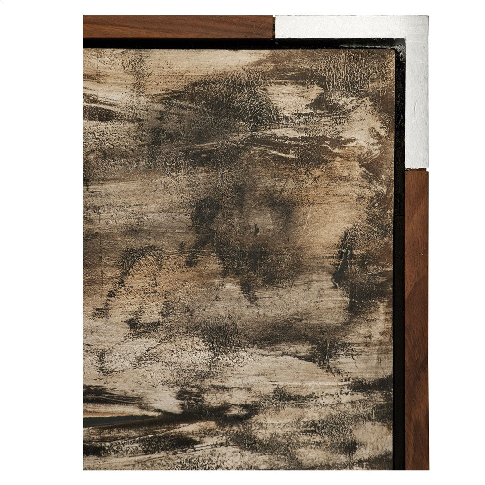 Arte abstracto realizado 100% a mano en técnica mixta de acrílicos, hoja de plata avejentada y textura montado en marco entrecalle parota con esquinas plata.