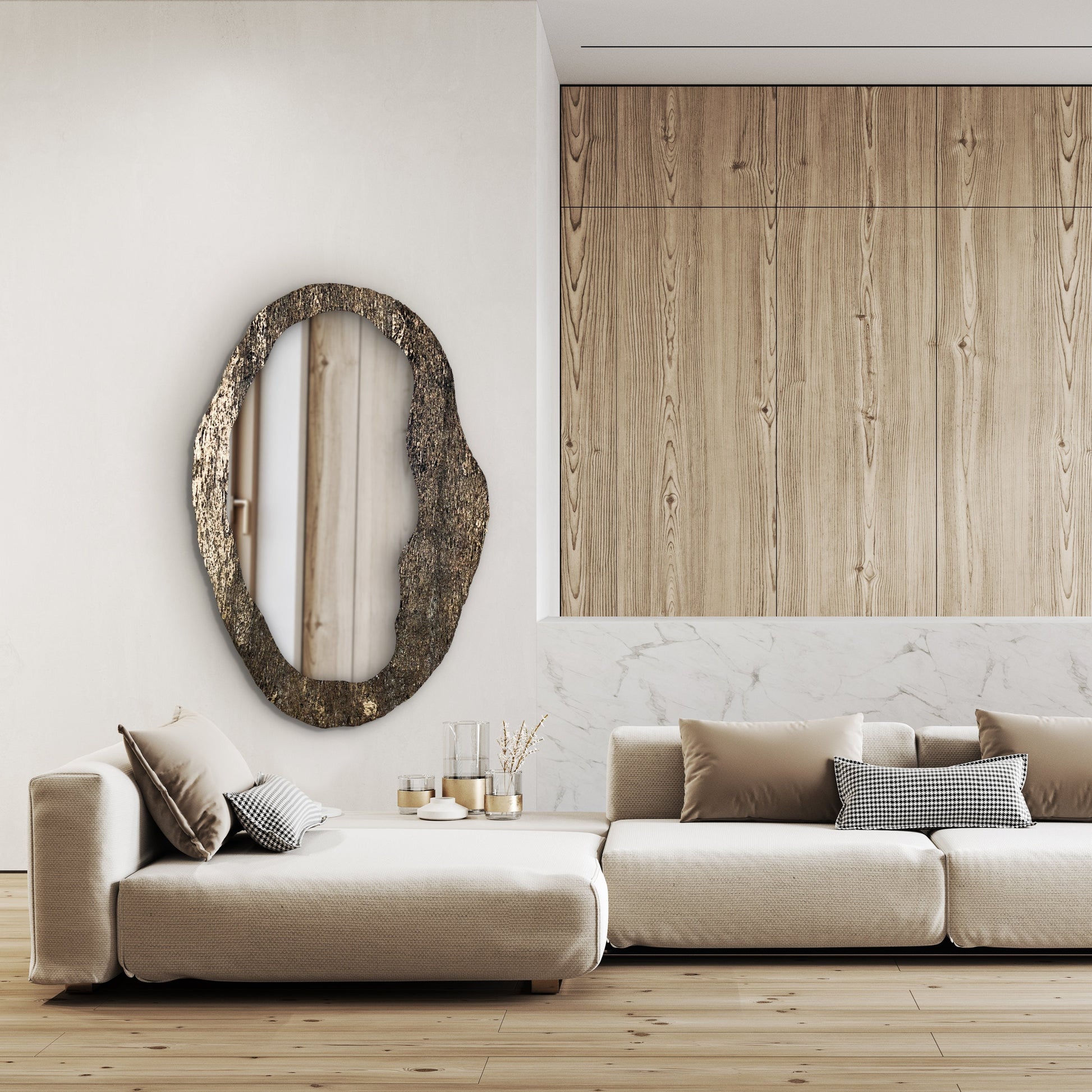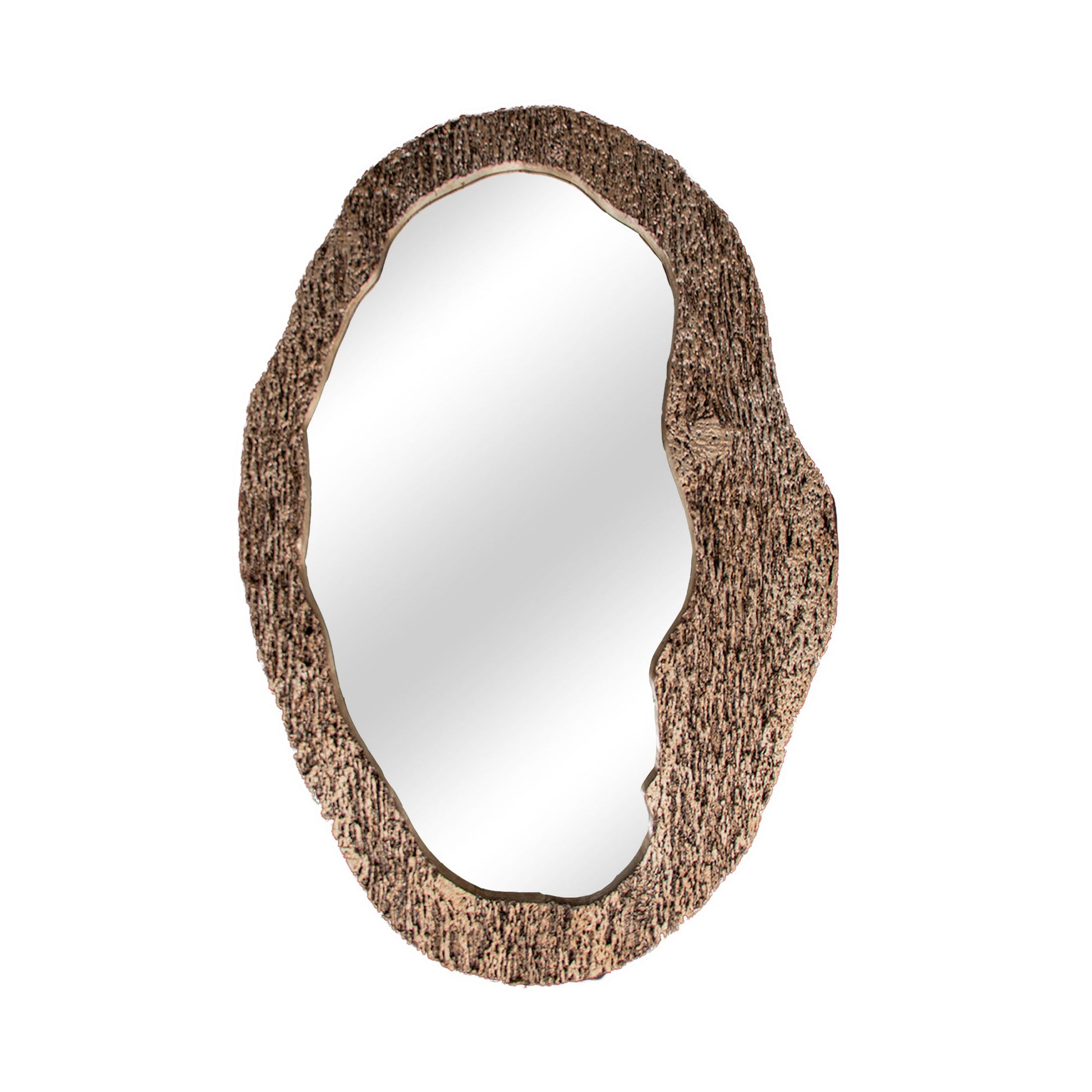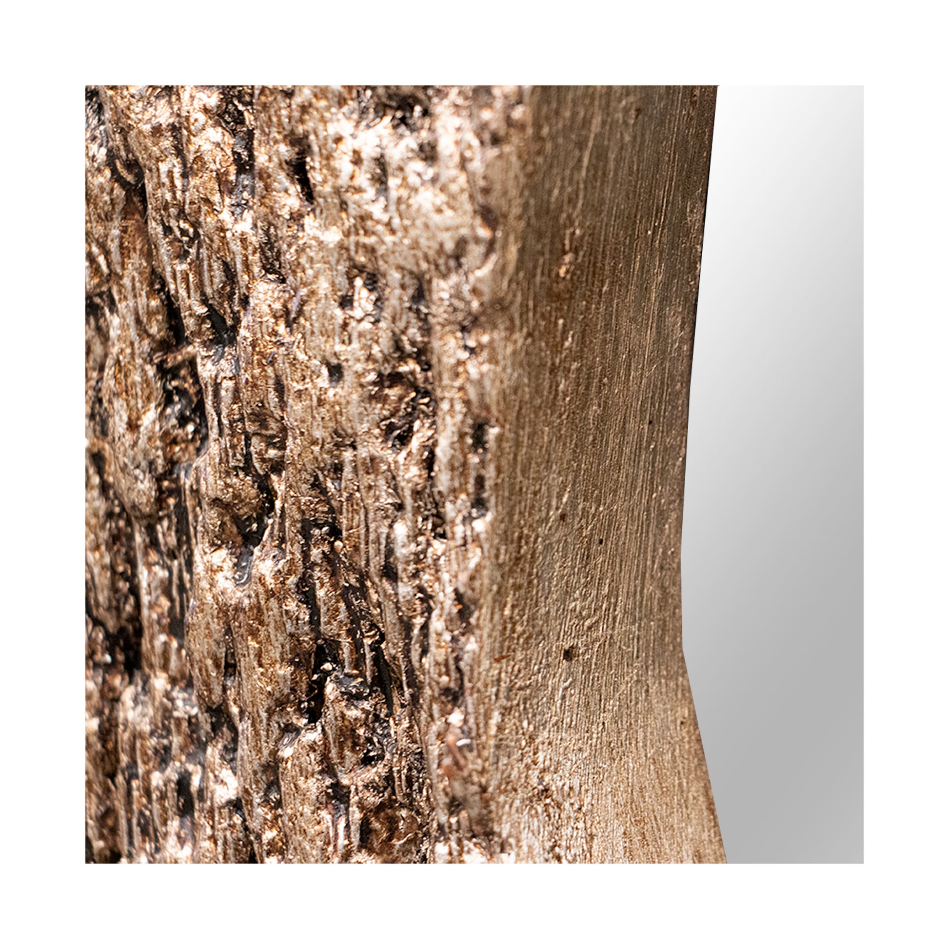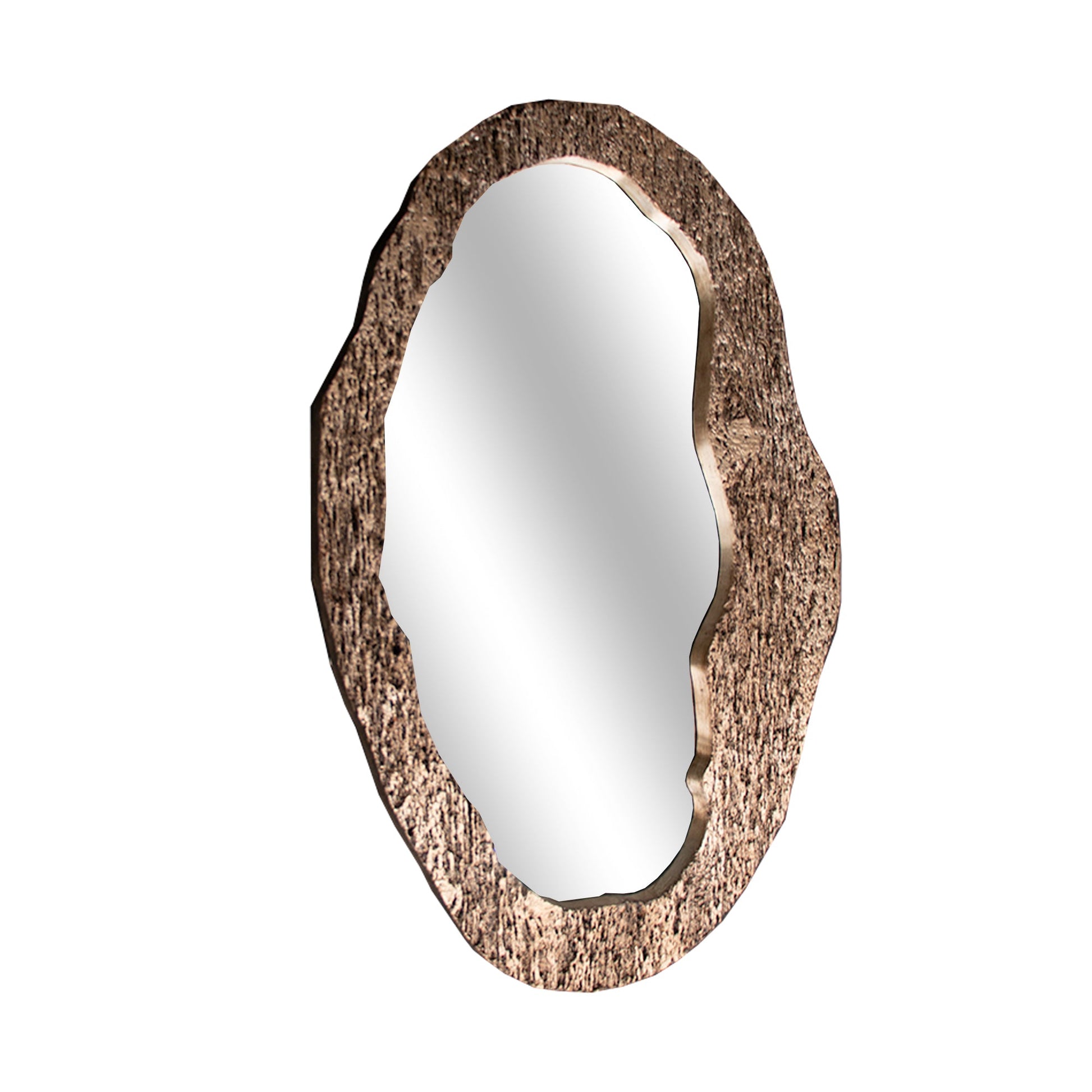 Espejo con estructura irregular de pared fabricado en madera picada con aplicación de hoja de plata avejentada. Luna de 3 mm.