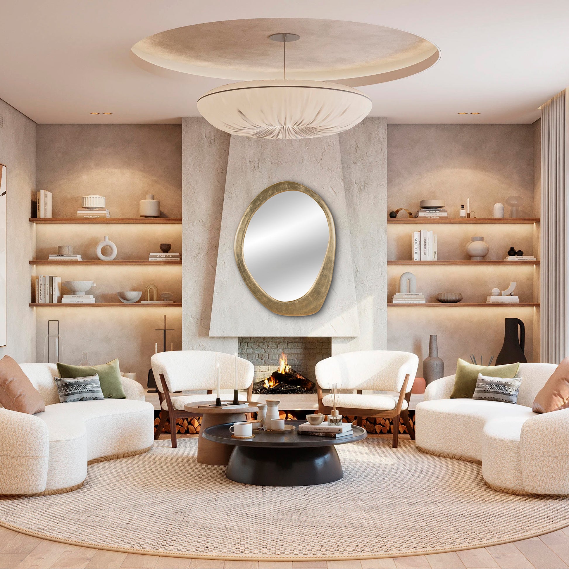 Espejo de pared de madera con estructura irregular intervenido en hoja de oro. Luna de 3 mm.