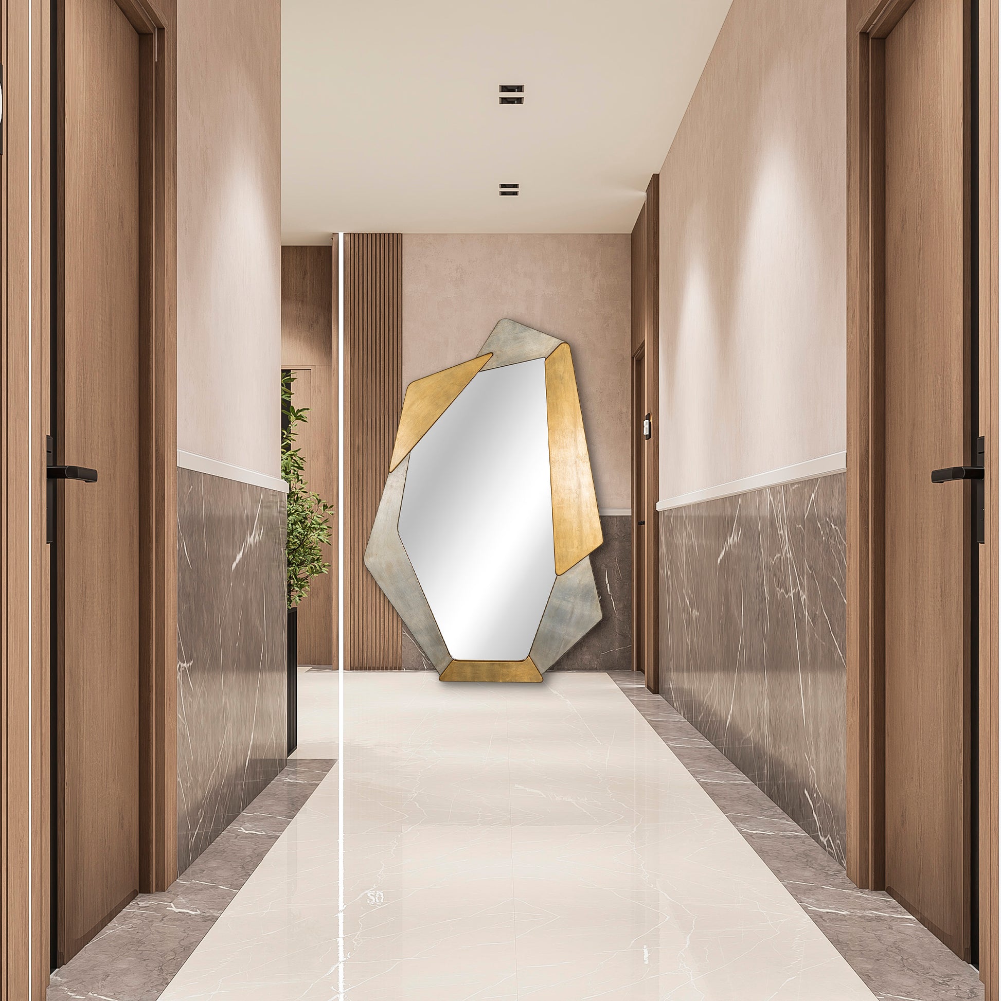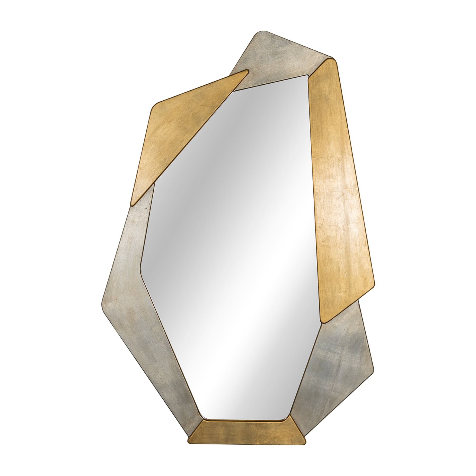 Espejo de pared, fabricado en madera, boleado, cubierto en hoja de plata y oro. Luna de 3 mm.
