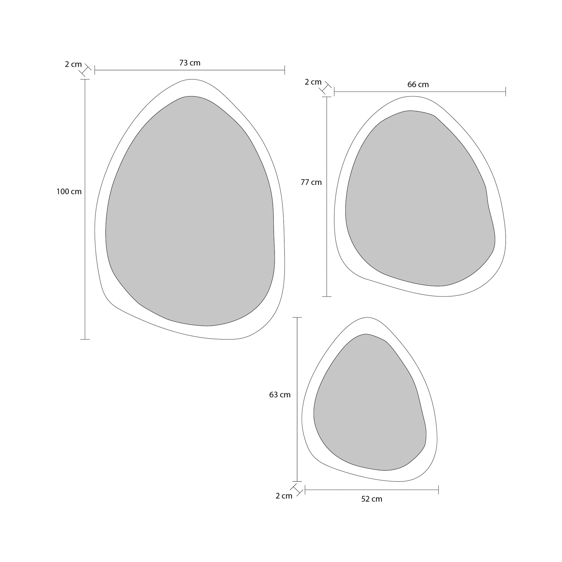 100x73x02 cm, 77x66x02 cm y 63x52x02 cm