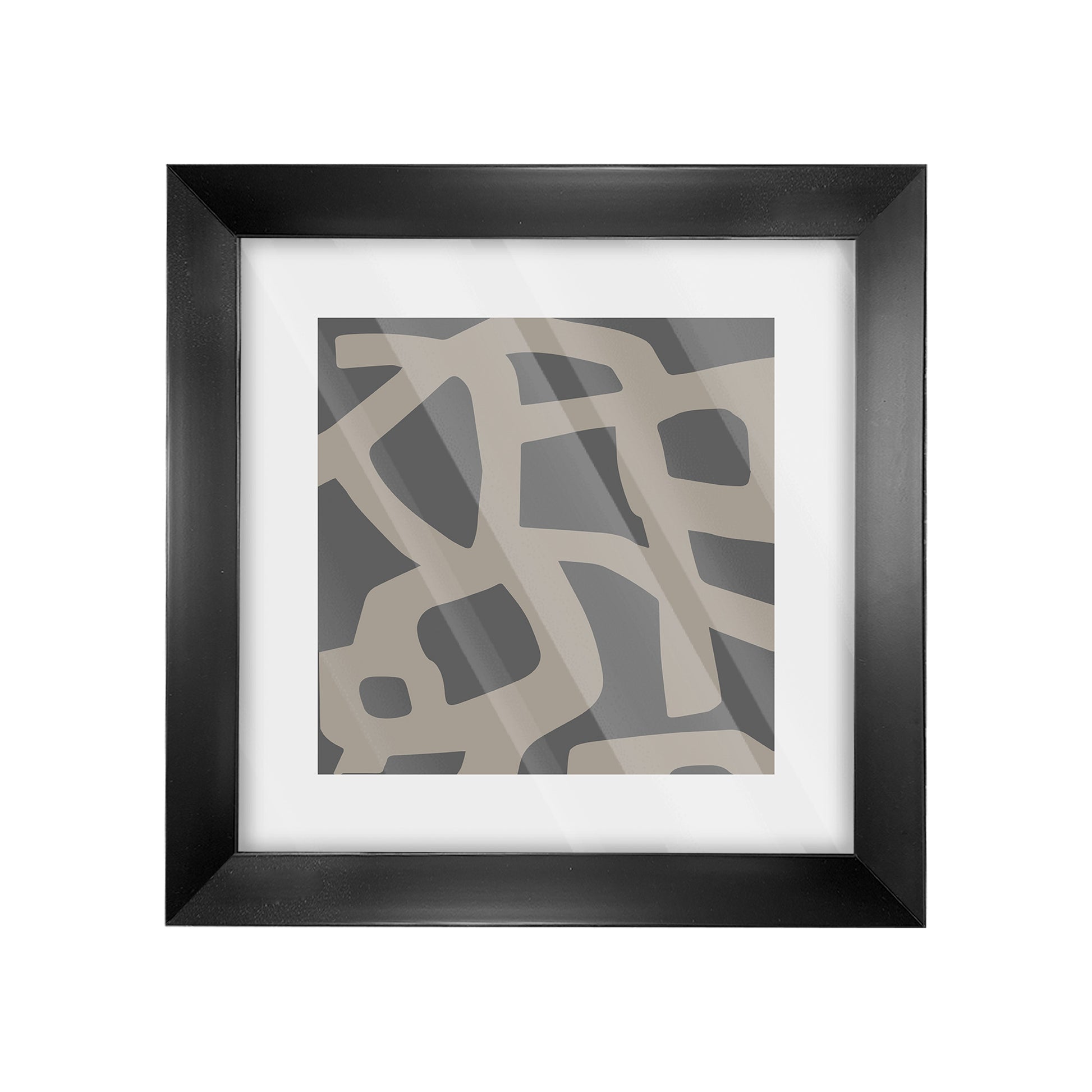 Impresión en alta definición en tela canvas de poliéster mate con respaldo de madera. Marco de poliuretano negro mate. Protegido con vidrio.